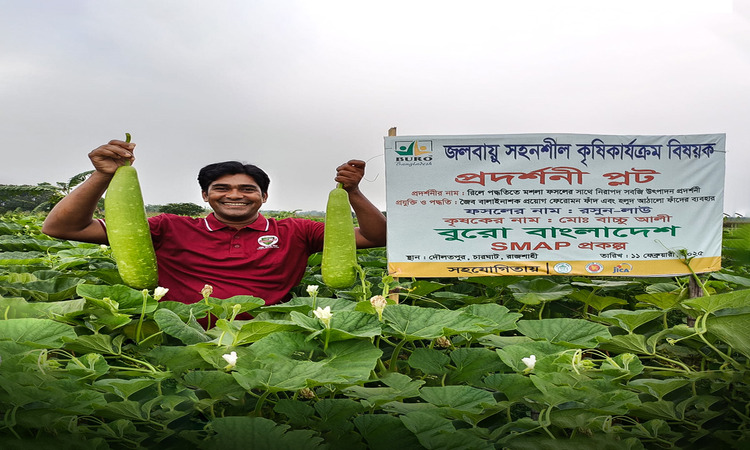 Md. Bacchu Ali, a farmer from Daulatpur, Rajshahi, is a member of one such group. With technical support from BURO Bangladesh, he transformed his field into a demonstration plot. Using the relay cropping method, he grew bottle gourd alongside garlic, earning quick returns by selling the bottle gourd before the full garlic harvest was ready. He also used pheromone and yellow sticky traps instead of chemical pesticides. This approach offers several benefits: